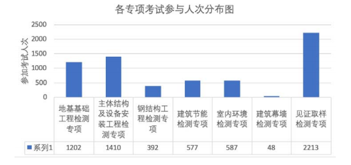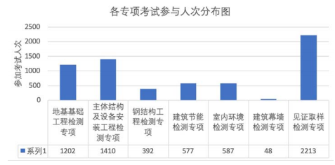 各專項(xiàng)考試人次分別為:地基基礎(chǔ)工程檢測(cè)專項(xiàng)1202人,主體結(jié)構(gòu)及設(shè)備安裝工程檢測(cè)專項(xiàng)1410人,鋼結(jié)構(gòu)工程檢測(cè)專項(xiàng)392人,建筑節(jié)能檢測(cè)專項(xiàng)577人,室內(nèi)環(huán)境檢測(cè)專項(xiàng)587人,建筑幕墻檢測(cè)專項(xiàng)48人,見(jiàn)證取樣檢測(cè)專項(xiàng)2213人,累計(jì)考試人次為:6429人次。詳見(jiàn)圖2。