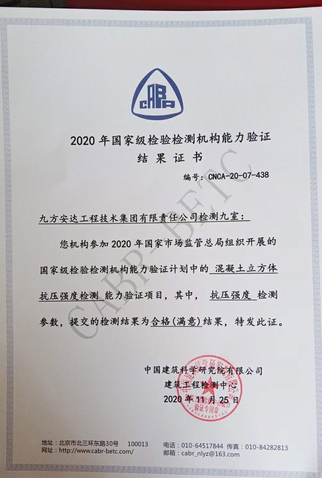 2020年7月,九方安達(dá)工程技術(shù)集團(tuán)有限責(zé)任公司(簡(jiǎn)稱九方檢測(cè))武漢中心試驗(yàn)室在總工程師和科室主任的指導(dǎo)下,嚴(yán)格按標(biāo)準(zhǔn)參與了中國(guó)建筑科學(xué)研究院有限公司建筑工程檢測(cè)中心組織的“混凝土立方體抗壓強(qiáng)度檢測(cè)”能力驗(yàn)證活動(dòng),并順利提交檢測(cè)結(jié)果。在2020年11月,九方檢測(cè)收到中國(guó)建筑科學(xué)研究院有限公司建筑工程檢測(cè)中心頒發(fā)的《2020年國(guó)家國(guó)家級(jí)檢驗(yàn)檢測(cè)機(jī)構(gòu)能力驗(yàn)證結(jié)果證書》,我司此次能力驗(yàn)證結(jié)果為“滿意”。