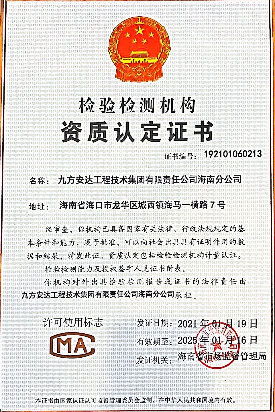 2021年1月19日,在九方安達(dá)集團(tuán)大力支持下,經(jīng)過(guò)海南和湖北分公司全體同仁的共同努力,九方安達(dá)工程技術(shù)集團(tuán)有限責(zé)任公司海南分公司通過(guò)了檢驗(yàn)檢測(cè)機(jī)構(gòu)資質(zhì)認(rèn)定增項(xiàng)評(píng)審。