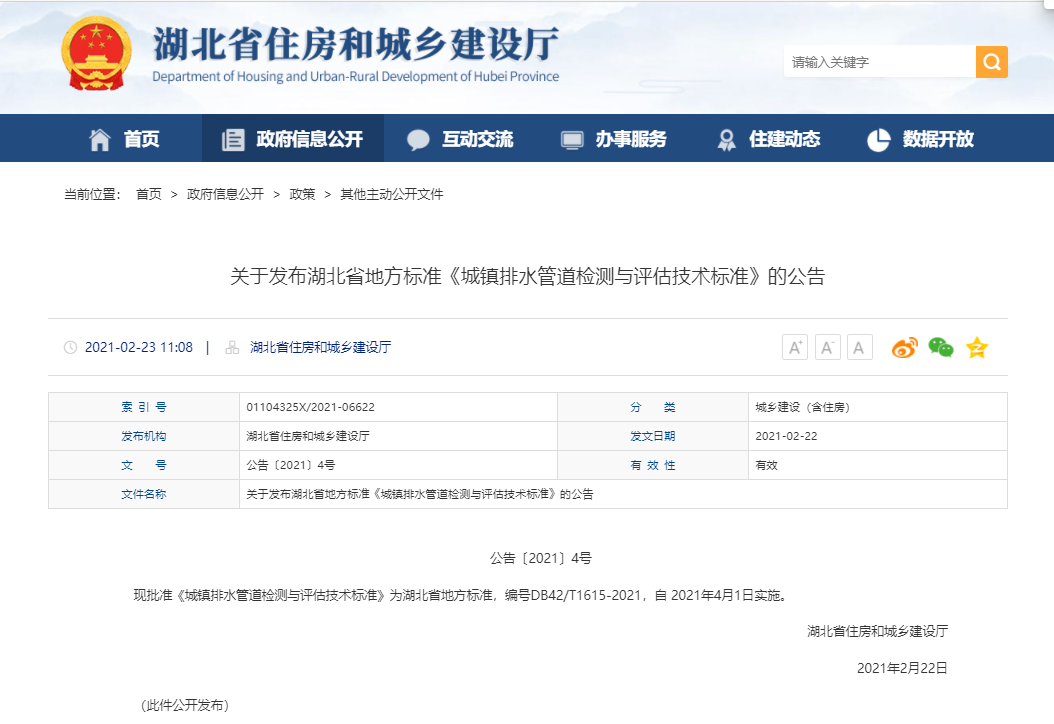 2021年2月22日,湖北省住房和城鄉(xiāng)建設(shè)廳發(fā)布了關(guān)于湖北省地方標準《城鎮(zhèn)排水管道檢測與評估技術(shù)標準》的公告,這代表著湖北省管道檢測領(lǐng)域?qū)⒂瓉硇碌陌l(fā)展機遇。