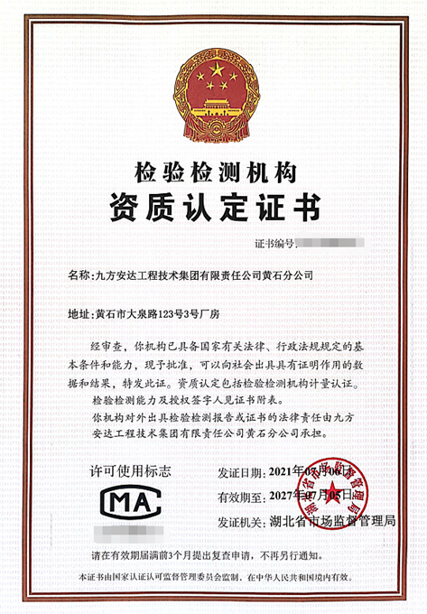 2021年7月6日,九方安達(dá)工程技術(shù)集團(tuán)有限責(zé)任公司黃石分公司(下稱黃石分公司)獲得湖北省市場監(jiān)督管理局頒發(fā)的檢驗檢測機(jī)構(gòu)資質(zhì)認(rèn)定證書。