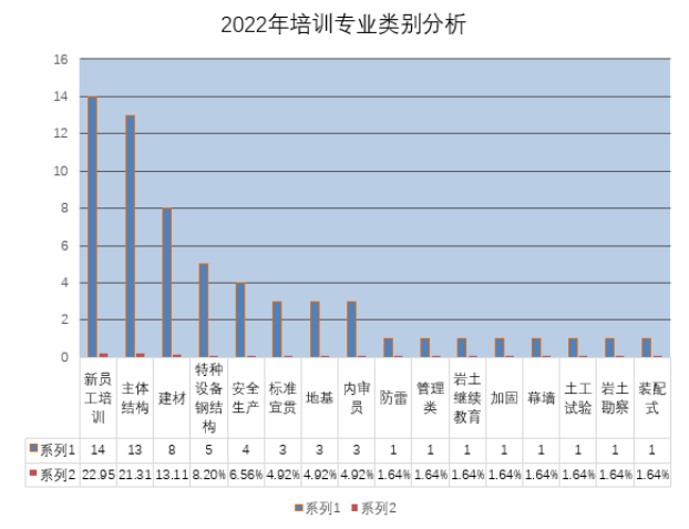 為提高企業(yè)競爭力,提升員工工作能力,九方檢測2022年持續(xù)開展培訓(xùn)活動,GFAcademy九方學(xué)院全年合計完成培訓(xùn)64場,內(nèi)部培訓(xùn)45場,外部培訓(xùn)19場;技術(shù)類培訓(xùn)23場,Seminar專家講壇外聘專家培訓(xùn)4場,“筑英伴途”管理類培訓(xùn)3場,新員工培訓(xùn)14場。技術(shù)類培訓(xùn)主體結(jié)構(gòu)專業(yè)、建筑材料專業(yè)和鋼結(jié)構(gòu)專業(yè)位列前三。有7位培訓(xùn)講師授課次數(shù)較高,逐步形成第一梯隊培訓(xùn)講師。