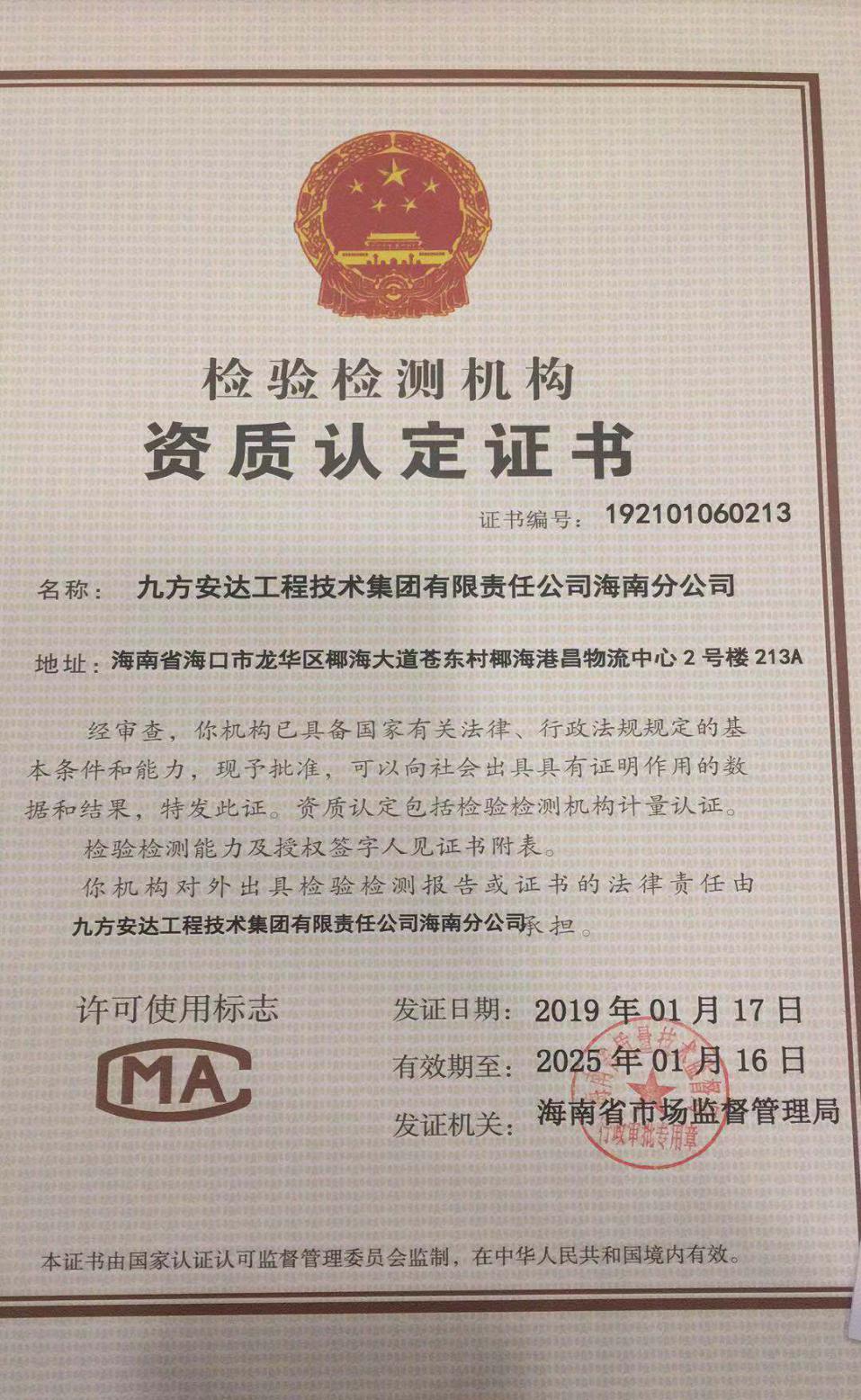 2019年1月17日,在九方安達集團公司大力下,經(jīng)過海南和湖北分公司同事長期共同努力,九方安達工程技術(shù)集團有限責(zé)任公司海南分公司取得《檢驗檢測機構(gòu)資質(zhì)認定證書》。